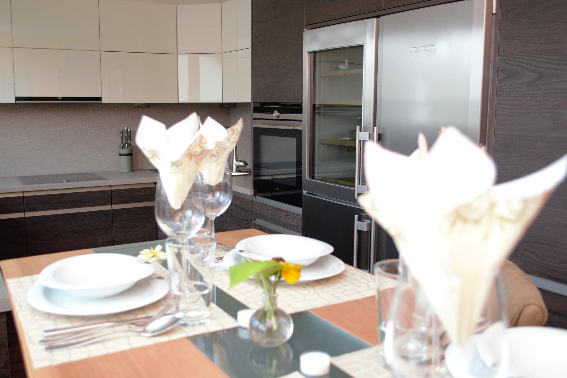 Hochtisch mit 4 Barhockern, Kaffeemaschine, Toaster, Wasserkocher, Mixer, Backofen mit Dampfgarer und Mikrowelle, Cerankochfeld, Geschirrspüler, Side-by-Side Kühlgefrierkombi mit Eiswürfelbereiter